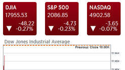 欧美股市:道琼工业指数收低26.51点,或0.15%,至17,977.24点;标准普尔500指数收跌3.79点,或0.18%,至2,087.79点;Nasdaq指数收跌10.44点,或0.21%,至4,895.79点。英股富时100指数收低0.78%,至6,260.92点,法股CAC指数跌0.52%,收报4,546.12点,德国DAX指数下滑0.76%,收报10,294.35点。