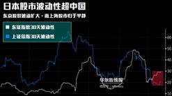 东京股市波动性高于上海股市波动性的幅度达到2014年11月以来的最高水平,因为投资者面对负利率和持续强劲的日元无所适从。与此同时,在大宗商品期货潮起潮落之下,中国股市看起来比较波澜不惊。