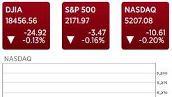 欧美股市:道琼工业指数收跌33.07点,或0.18%,至18,448.41点;标准普尔500指数收低2.97点,或0.14%,至2,172.47点;纳斯达克指数下跌5.49点,或0.11%,收报5,212.20点。英股富时100指数收低0.28%,法股CAC指数收跌0.65% ,德股DAX指数收低0.88%。