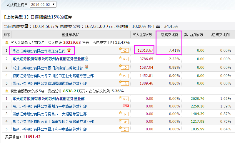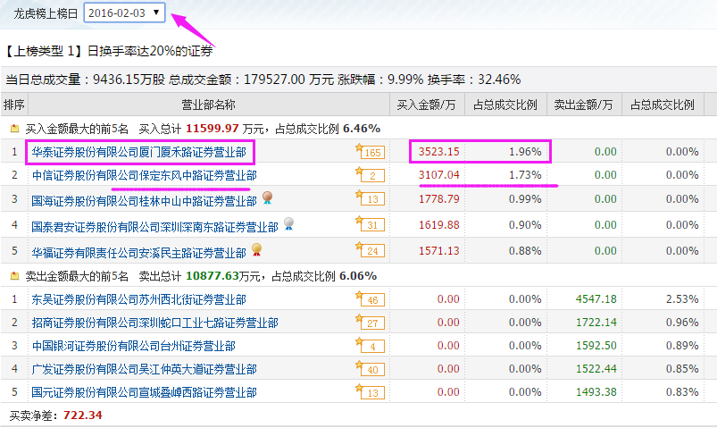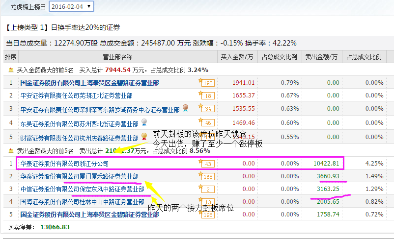 龙虎榜,2016年2月4日,卖方营业部。“华泰浙江分公司”、“华泰厦门厦禾路”“中信保定东风中路”全部出货,买方零散的营业部都是接盘的。华泰浙江分公司这一笔,两个交易日一进一出至少赚了1.5个涨停板。厦禾路和中信保定东风中路也有的大肉吃。
