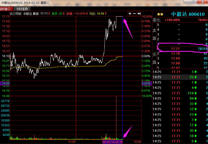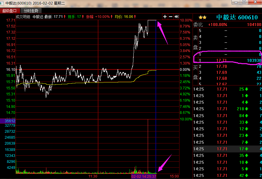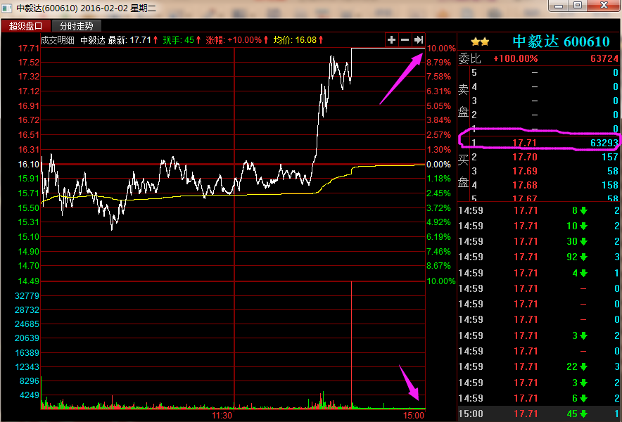 下面以中毅达2016年2月2日的盘口信息为例,来一起看看赵老哥是怎么封板、加单、出货的。