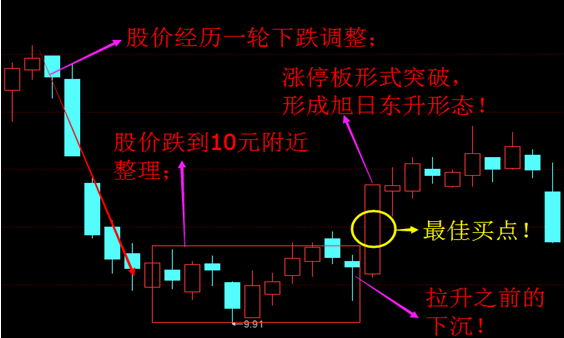 旭日东升K线战法的解释:股价经过一轮调整下来,在相对低的位置横盘整理,或者在较小空间上下震荡整理,为下一步拉升蓄势;股价突然向下猛的一沉,完成最后的洗盘动作,而后用涨停板拉起,突破平台;这个方法叫做旭日东升。