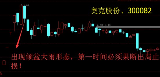 倾盆大雨形态是股价经历一轮大幅且快速上涨之后,第二天突然低开,且一路走低,第三天依然下跌,这里已经构成了短线的卖点。如果这里还不卖出股票,估计马上洪水、山洪就要到来了,到来之前一定要手起刀落斩仓走人,千万不要和趋势抗衡,不然你只有留下抱着电线杆不断挣扎的背影。下图就是倾盆大雨形态: