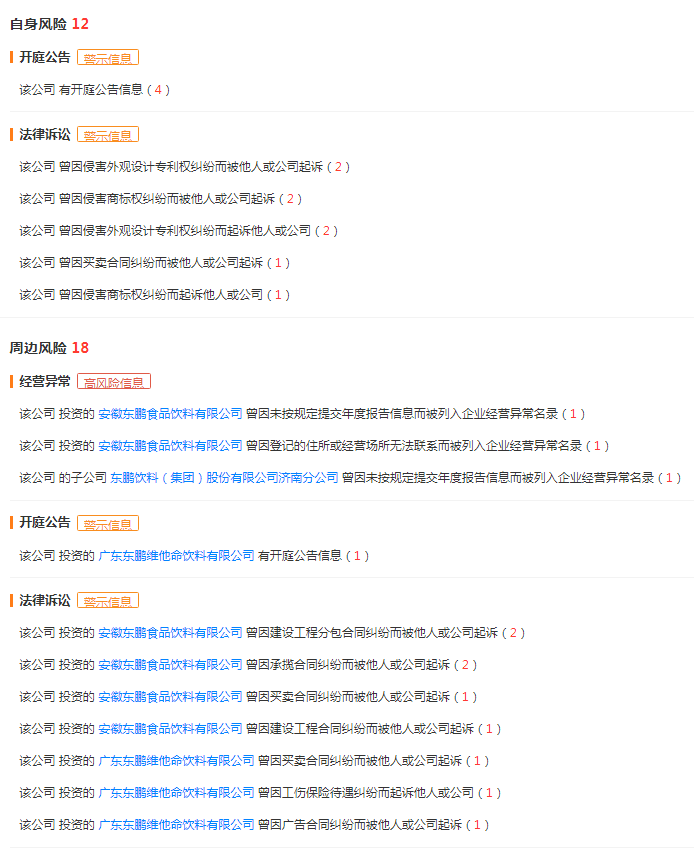 | 经营范围 | 一般经营项目是:食品机械及包装材料的销售与技术咨询;房屋租赁;电子商务平台技术开发和系统开发、电子政务系统开发;信息传输、软件和信息技术服务;计算机软件、信息系统软件的开发、销售;信息系统设计、集成、运行维护;信息技术咨询;集成电路设计、研发;企业管理咨询(不含限制项目);信息化解决方案开发与应用;高可信计算、智能网络、移动互联网、物联网等技术与应用;基于网络的软件服务平台技术开发、软件的开发、测试服务;信息系统集成、技术咨询。(以上各项涉及法律、行政法规、国务院决定禁止的项目除外,限制的项目须取得许可后方可经营);国内贸易(不含专营、专卖、专控商品);经营进出口业务(法律、行政法规、国务院决定禁止的项目除外,限制的项目须取得许可后方可经营)。,许可经营项目是:预包装食品(不含复热预包装食品)批发(饮料、无酒精饮料、包装饮用水);保健食品(限东鹏特饮)批发;普通货运;饮料、无酒精饮料、包装饮用水生产与销售。生产、销售:保健食品、饮料(凭许可证在有效期内经营,具体项目以审批部门批准的为准);酒、精致茶;生产、加工:饮料包装容器;生产、销售瓶(桶)装引用水类(饮用纯净水);生产销售其他饮料(营养素饮料);数据挖掘、数据分析与数据服务;互联网数字内容开发;中药有效成份的提取、纯化及销售。 | |||