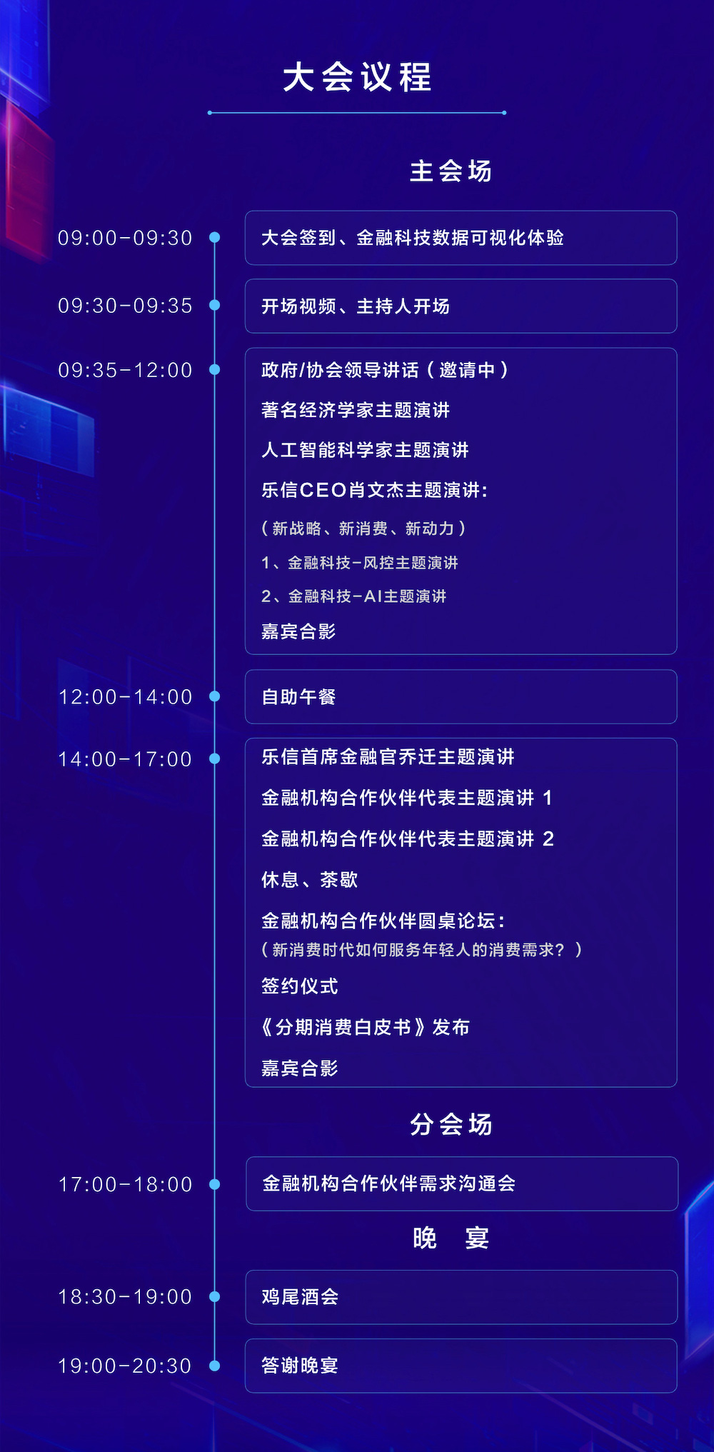乐信合作伙伴大会:2019年4月18日,第三届乐信合作伙伴大会在深圳举行。本届大会围绕“新消费 新动力”展开,乐信创始人兼CEO肖文杰、总裁吴毅、首席金融官乔迁、首席风控官刘华年等与各位合作伙伴一起,共同探讨在“新消费”时代下,如何用科技的力量,更好地服务新消费人群,建立共赢的金融科技生态,发挥消费金融对促进消费、推动经济增长的积极作用。