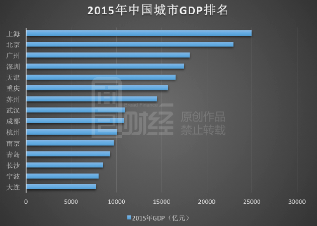 下图为面包财经根据国家统计局绘制的2015年中国城市GDP排名: