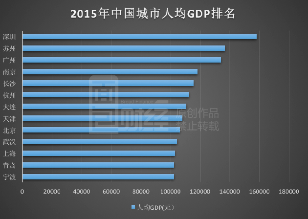 北京和上海的人均GDP排名较低。按照2015年的统计数据:不仅远低于深圳和广州,也低于苏州、南京和杭州等传统二线城市。