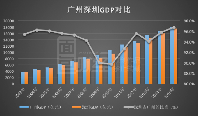 2004年深圳的GDP总量曾经达到广州的96.2%,距离赶超仅一步之遥。但随后的几年不仅没有实现超越,还被广州越甩越远。到2010年时,深圳的GDP仅相当于广州的89.7%,是过去十多年中首次跌破九成。