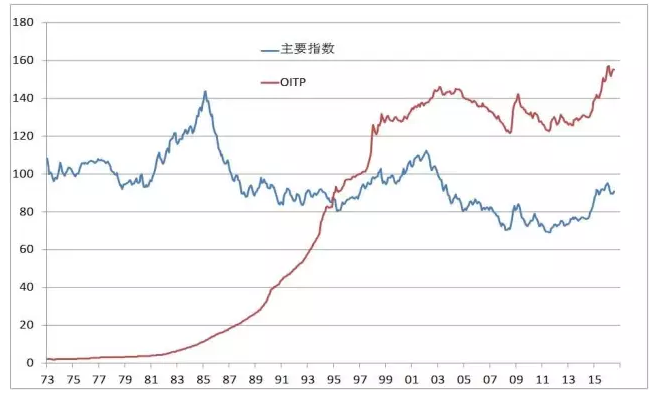 王晓东专门研究了1973年年初至今的美元指数(major,指对欧元、日元、英镑等7个主要国际货币)的走势,发现美元指数至今只贬值了15%左右;但对中国、俄罗斯、印度、巴西、南非、墨西哥等约20个国家货币的美元指数(OITP)同期升值却超过70倍。尽管相对于major国家,OITP国家的经济整体上蓬勃向上,但汇率却无一例外地出现超大幅度贬值。